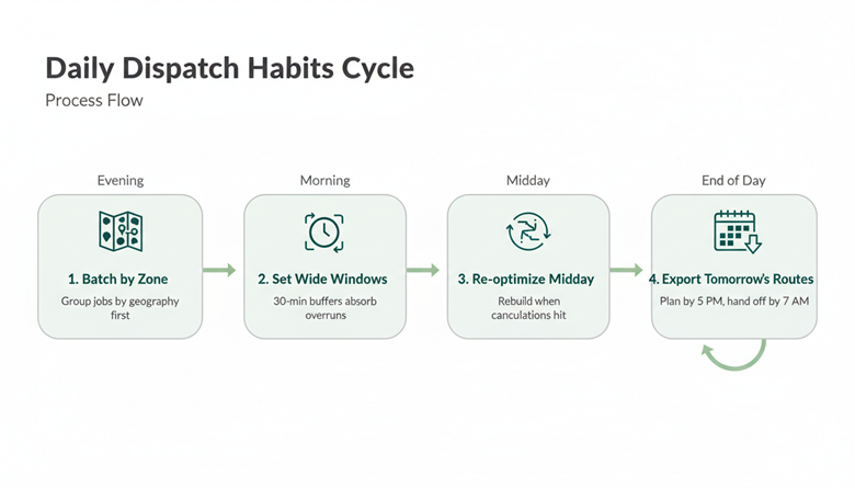 Export tomorrow’s routes before you leave the office. Morning scrambles cause mistakes. A dispatcher who plans routes by 5 PM today hands each tech a clean path by 7 AM tomorrow.